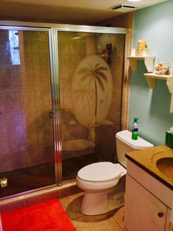 Features a King size bed, dressers, flat screen TV. The en suite bathroom has a large vanity, shower, plus walk in closet. The guest bedroom has a king size bed (2 twin mattresses together) or can be 2 twin bed apart and a walk-in closet. Convenient to the guest bedroom is the hall bath with a shower stall (NO TUB).